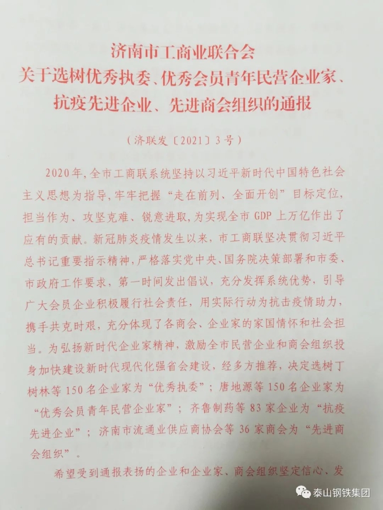 泰山钢铁集团获“抗疫先进企业”荣誉 王永胜董事长被评为“优秀执委”