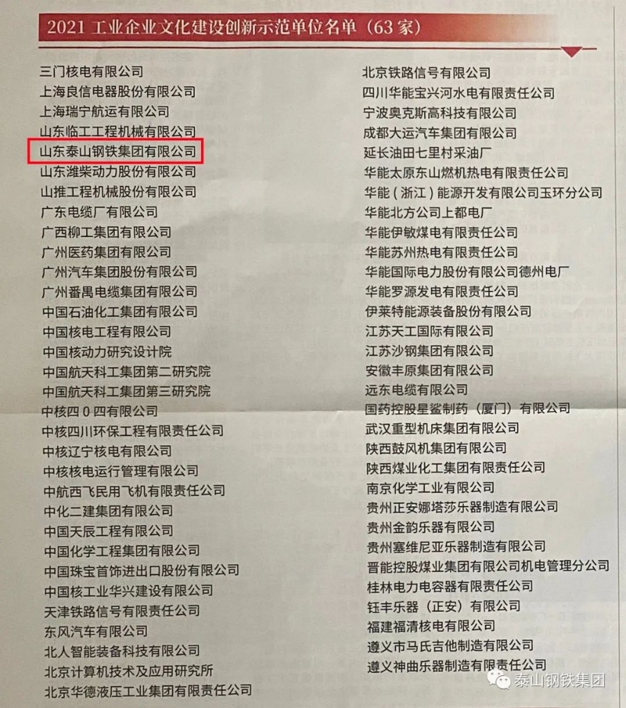 泰山钢铁集团荣获两项“2021年工业企业文化建设创新示范荣誉”
