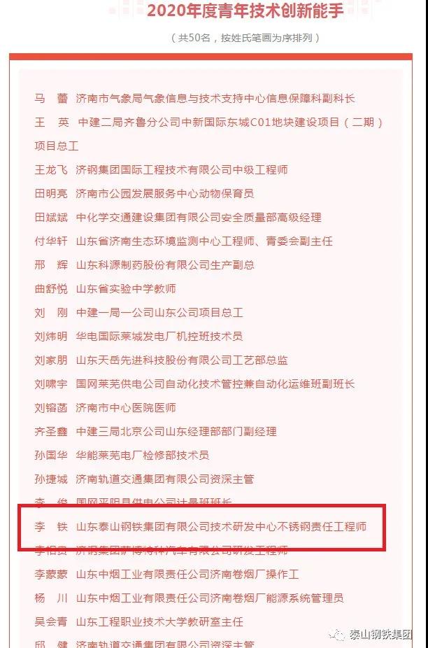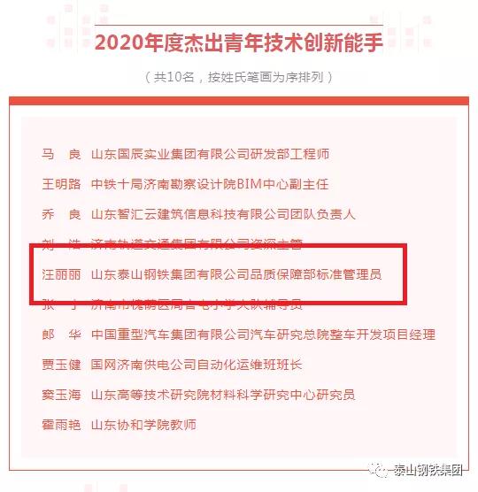 今年,团市委同市委统战部、市发展改革委、市教育局等13家单位联合启动了2020年度济南市“双能手”人选认定活动,表彰一批政治素质高、创新能力强、业务技能精、职业道德高的优秀青年。近日,“双能手”名单正式公布,其中,泰山钢铁集团品质保障部职工汪丽丽荣获“2020年度杰出青年技术创新能手”荣誉称号,技术研发中心职工李铁荣获“2020年度青年技术创新能手”荣誉称号。