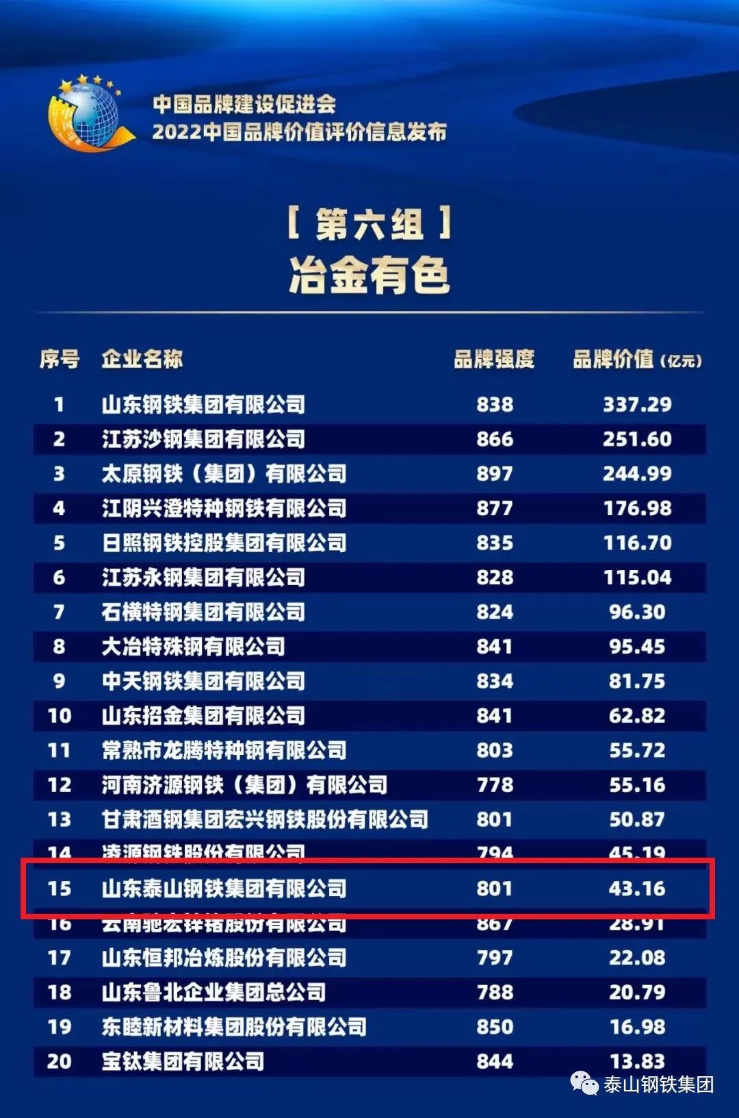 9月5日,中国品牌建设促进会、中国资产评估协会、新华社民族品牌工程办公室等单位在京联合举办“2022中国品牌价值评价信息发布”线上活动。在发布的“2022中国品牌价值评价信息”中,泰山钢铁集团以品牌强度801、品牌价值43.16亿元,位列冶金有色组第15位。